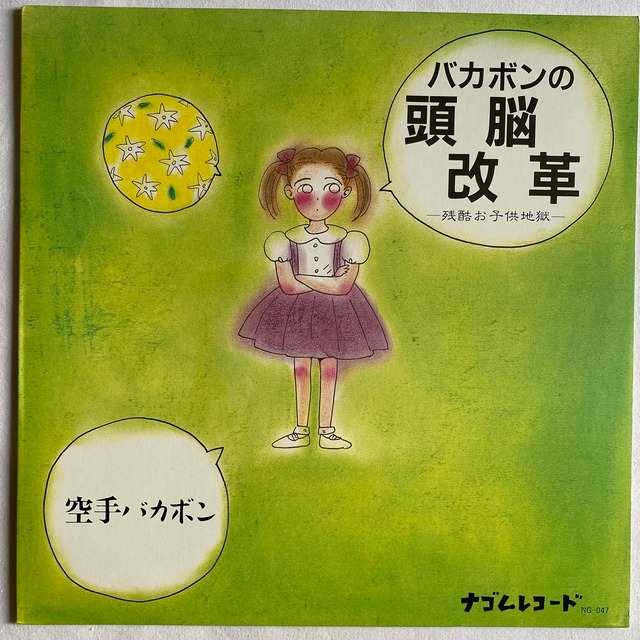 87年リリース、筋肉少女帯のシングルです。タイトルといい、ジャケットの絵といい、権利問題というか大人の事情でリリースができなくなりそうであった展開とその顛末はネットで調べる価値あり。メジャーに行ってからもシングルとしてリリースされましたが、自主制作の本盤とは若干(というかある意味で大いに)歌詞が違います。そしてサウンドはメジャー・リリース盤のものよりカオティックでハードです。ナゴムレコードからのリリースなのに45回転2曲入りという、ほぼプロフェッショナルなプロダクトで、音圧も申しぶんなし。間奏の三柴江戸蔵のピアノがもの凄くメランコリックです。大槻ケンヂに脅されているブーさんのイラストは上條淳士によるものです。