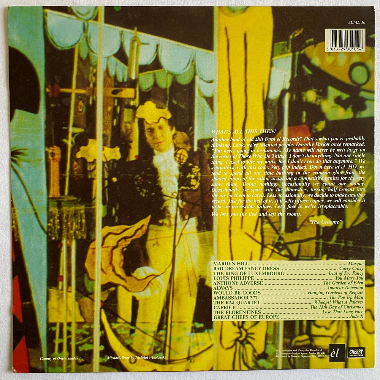 88年リリース、ネオアコ・ムーヴメントをけん引したイギリスのエル・レーベルの名コンピレーションの第2弾です。小気味良いポップ・チューンだらけの1枚目は名盤の誉れが高いですが、2枚目の本作も1枚目に負けず劣らず良い内容です。今回もアルバムの冒頭を飾るのはマーデン・ヒル。ラウンジーなギター・インストで幕を開けます。その後、キング・オブ・ルクサンブルグ、ルイ・フィリップ、アンソニー・アドヴァースなどおなじみのメンツと、ほとんど無名なアーティスト名が続きますが、おしなべて前作に比べどれも断然ポップです。ポップさが増している要因としては女性ヴォーカル曲が多いということがあげられるかもしれません。作品全体に明らかにカラフルな色彩を与えています。特にA2のパンキーなナンバーは本作の白眉と言ってもいいほどの出来の良さ。聞いたことのない名前のバンドのB4はフィリップ・オークレア(ルイ・フィリップ)とアイレス・イン・ギャザのマーティン・ベイツのユニットです。思わずにこやかになってしまう大合唱アカペラのB5で盛り上がって最後は短いラウンジ・ミュージックでクールダウン。お腹いっぱいになってもまだもう一度最初からいけそう。これは第1弾より名盤かも。