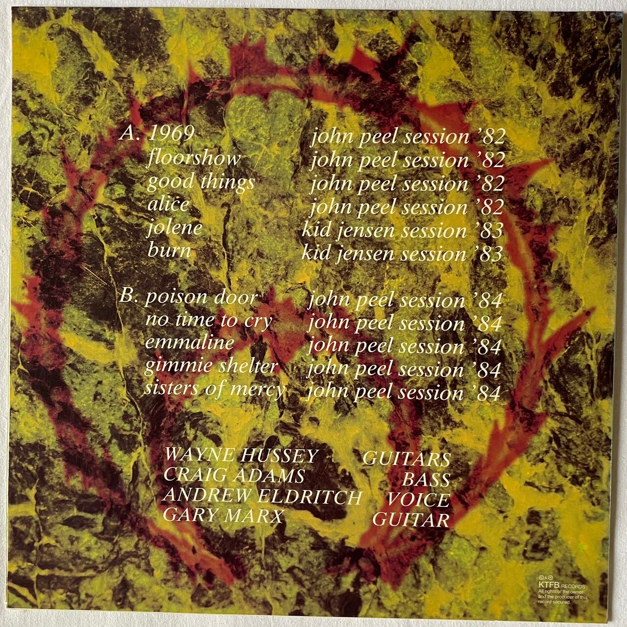 86年リリース、リーズ出身のゴス・ロック/ポジティヴ・パンクバンド、シスターズ・オブ・マーシーのライヴ・コンピレーション・アルバムです。シスターズ・オブ・マーシーのディスコグラフィには載っていない、ドイツのラウンジング・レコードからのいわゆるブートレグ(海賊盤)ですが、数多いブートレグの中でも有名な作品です。収録内容は、A1からA4が82年9月7日のBBCジョン・ピール・セッションの録音、A5とA6がBBCデヴィッド "キッド" ジェンセンのセッション、B1からB3は84年7月11日のBBCジョン・ピール・セッション、B4とB5も84年のジョン・ピール・セッションと裏ジャケには書かれていますが、これは83年8月28日に行われたアムステルダムのパラディソでのライヴが収録されています。ブートレグなので熱心なファン向けではありますが、それなりに聴きどころはあり、例えば4曲あるカヴァー曲は一聴の価値ありです。A1はストゥージズ、A5がドリー・パートン、B3はホット・チョコレート、B4がローリング・ストーンズがオリジナルで、その中でもドリー・パートンのジョリーンはとても意外です。まったく交わらない音楽性のこの曲を、なぜ彼らがカヴァーしてるのか本当に謎で、ハードロック版というか暗黒版ジョリーンとして聴くことができます。また、A面とB面とで、バンドの成長の過程を感じることもできます。A面は録音状態にも原因がありますが、演奏がしょぼい。チープなドラム・マシンのサウンドが悲しくなるほどです。一方でB面は、完全にバンド・サウンドが確立し、堂々たる演奏を聴くことができますが、この後にサウンドの要であったウェイン・ハッセイとクレイグ・アダムスは脱退してしまうことになります。