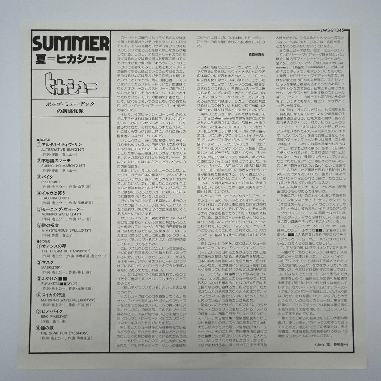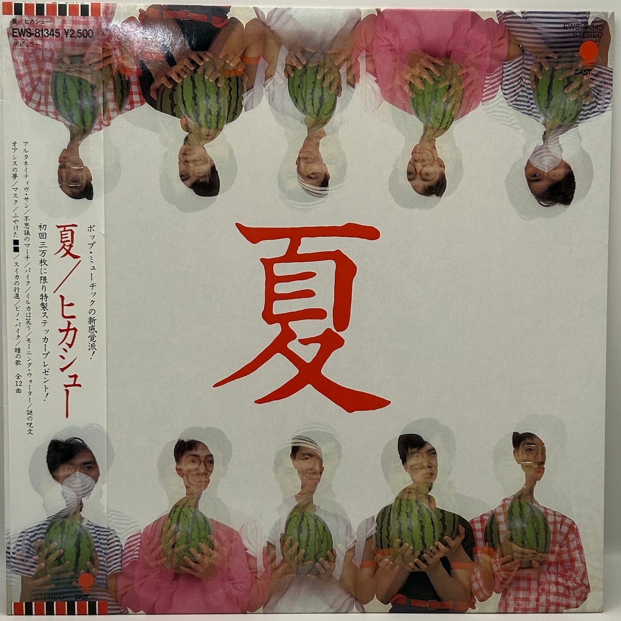 80年リリース、日本のニューウェイヴ・バンド、ヒカシューのセカンド・アルバムです。前作からわずか5ヶ月で発売された本作は、リリース時期もあってかタイトルは夏。だからといって夏っぽい雰囲気を感じられるナンバーはなく、むせび泣くフリージャズ的なサックスでアルバムは始まります。巻上公一のヴォーカリゼーションではどうやっても夏とは結びつけられませんが、この場合の夏は湿度が高く眠れない夏の熱帯夜といったところでしょう。それはともかく、収録曲のB1はカーステレオのCM曲に採用され、A3はカナダ産のホラー映画「チェンジリング」のイメージ曲となり、どちらもヘヴィ・ローテーションでお茶の間に流れたということもあって、セールス的にはけっこう売れたアルバムです。ドラムスでジューシィフルーツの高木利夫が全面的に参加しているので、ビートがリズムボックスであったファースト・アルバムに比べて、サウンドのダイナミズムとロックさが増しています。