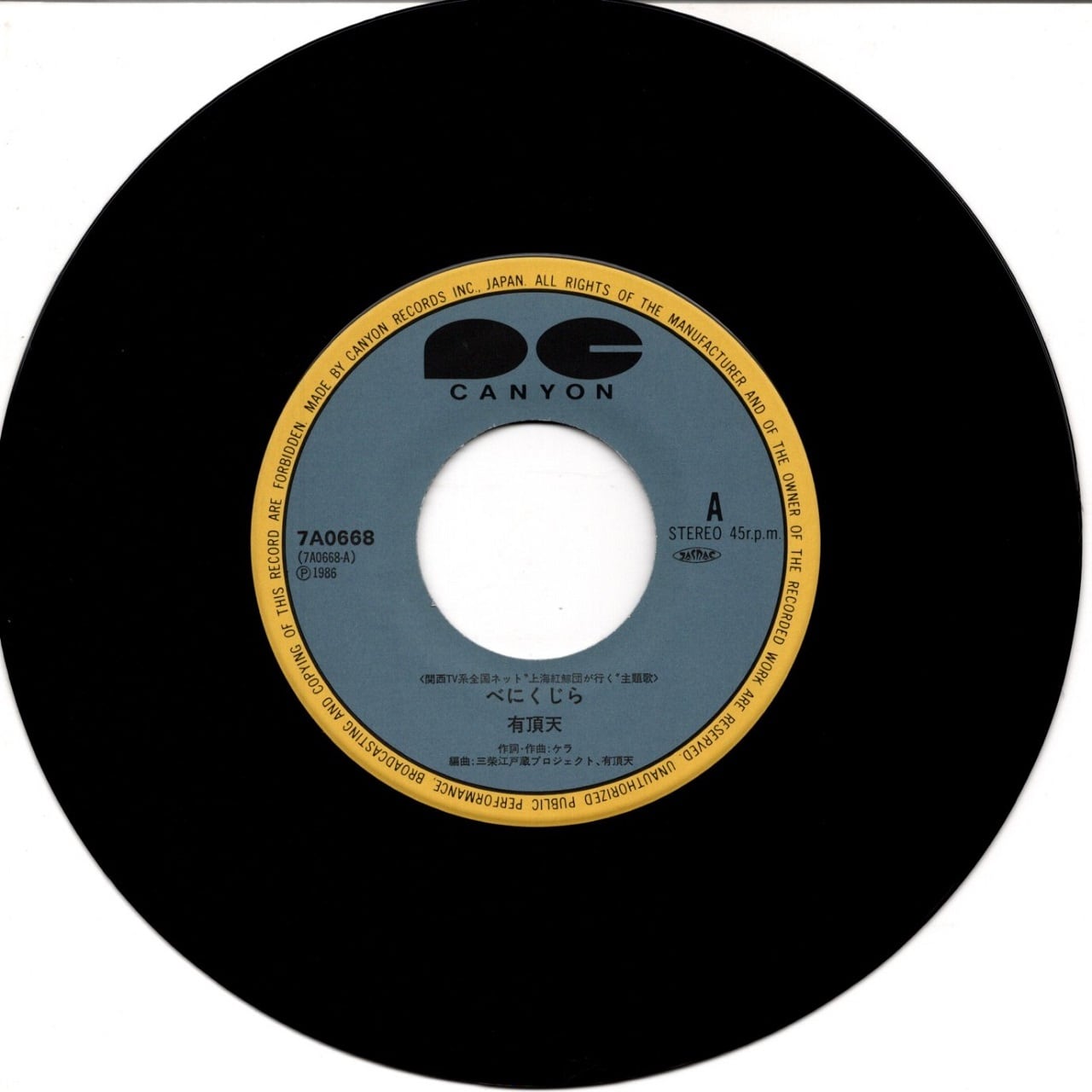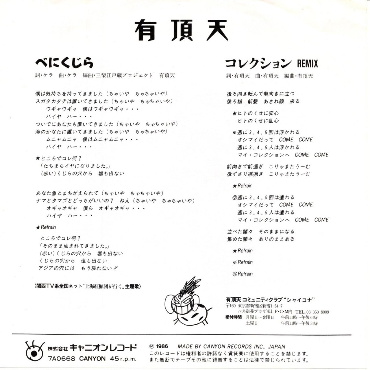 86年リリース、有頂天のメジャーでのセカンド・シングルです。ぎくしゃくしたビートで、且つナンセンスすぎる歌詞の曲ですが、フジテレビの深夜番組「上海紅鯨団が行く」のオープニング・テーマ曲でした(テリー伊藤演出、片岡鶴太郎司会!)。まあ楽曲云々ということよりレコード会社がキャニオンでフジテレビ系列ということでの採用かもしれません。編曲で、筋肉少女帯の超絶技巧&変態ピアニストの三柴江戸蔵が参加。ジャケット画は水木しげるによるものです。