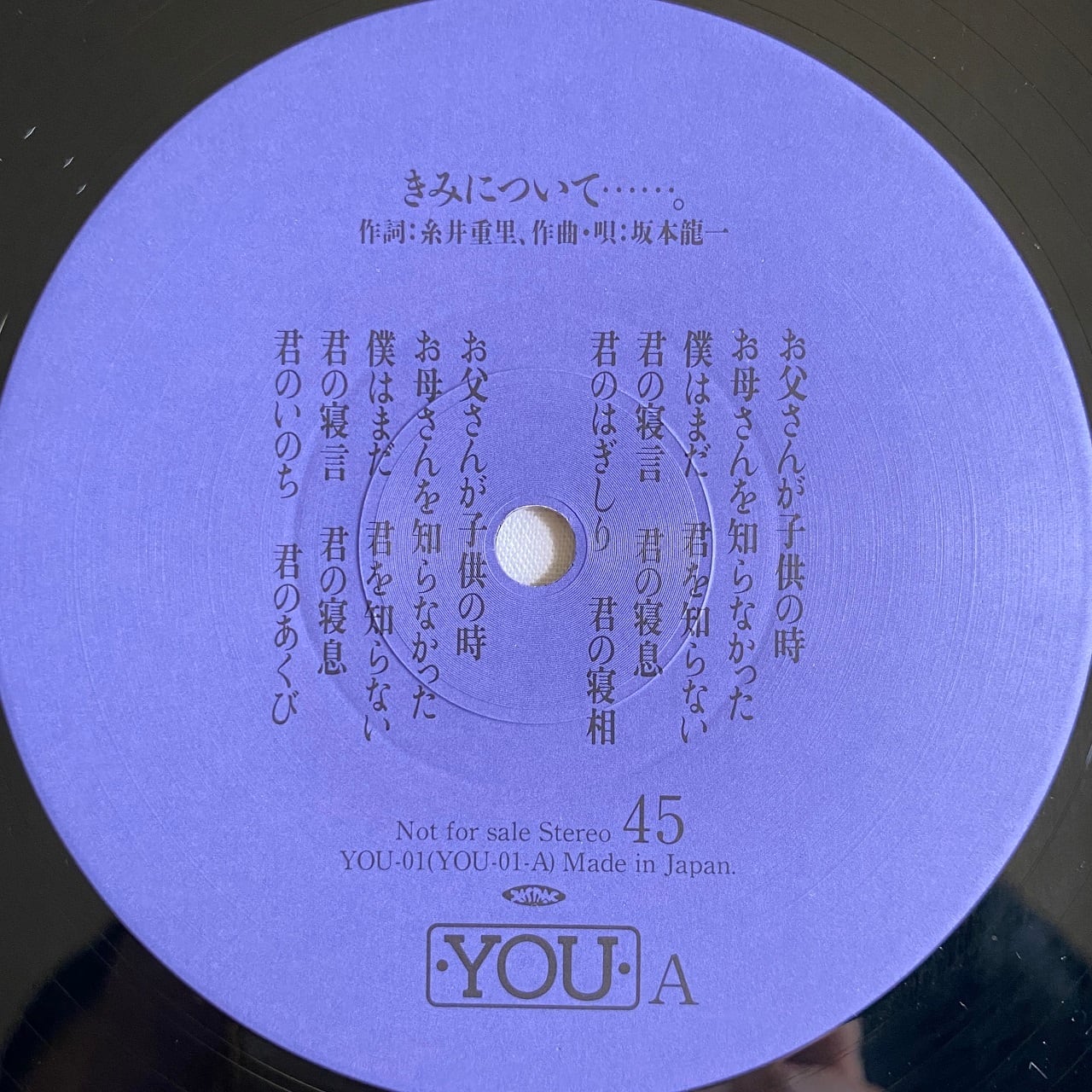 83年リリース、坂本龍一の12インチEPです。保険会社の日本生命がプロモーション用に配布したレコードで、当時はCM曲としてテレビでヘヴィ・ローテーションで流れました。糸井重里が作詞を担当し、その歌詞を坂本本人が味のある声で歌を歌っています。坂本と糸井は一緒にたくさんの仕事をしているイメージがありますが、坂本自身の作品で糸井の作詞はこの曲だけ。糸井と共作が多いのは(当時の奥方である)矢野顕子のほうでした。当然オリジナル・アルバムには未収録ですが、84年リリースのアルバム「音楽図鑑」のカセットテープ・ヴァージョンにのみ収録されています。B1はクールなシンセ・ファンク。B2はかわいいシンセと流麗なピアノがメロディを奏でるインストです。演奏には、坂本のほかにドラムに高橋幸宏、パーカッションに浜口茂外也、サックスに矢口博康が参加しています。B面2曲のビートのパターンがYMOの「ラップ現象」(細野晴臣作)に似ていますね。