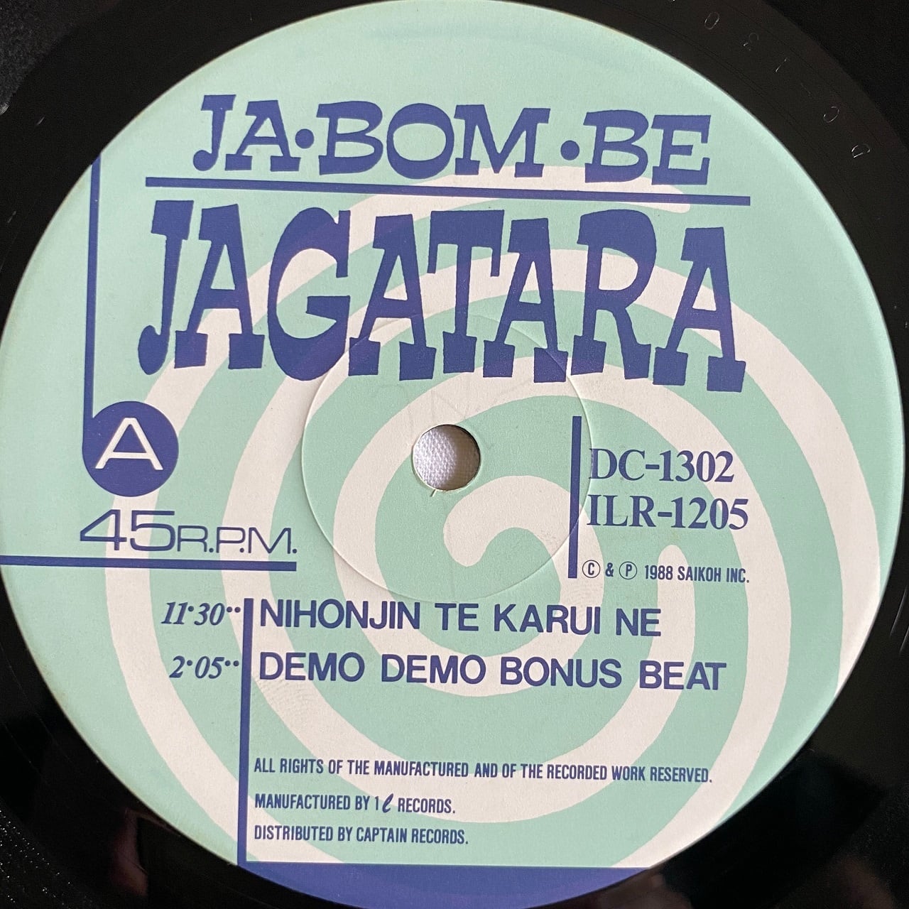 88年リリース、JAGATARAの通算2枚目の12インチ・シングルです。セカンド・アルバム「裸の王様」同様、インディーズのドクター・レコードからのリリースで、A1は暗黒大陸じゃがたら名でリリースしたファースト・アルバムA面1曲目の「でも・デモ・DEMO」の改題、B面曲はイアン・デューリー&ザ・ブロックヘッズの有名曲の日本語カヴァーです(A2はOTO制作のおまけ)。2曲ともヴォーカルのアケミによるアジテーション・ヴォーカルが強烈で、どちらも10分以上というこの長尺のライヴ・ヴァージョンは、渋谷PARCOスペースパート3で収録されたものです。前作の12インチ・シングルは「タンゴ」に「クニナマシェ」といまいち踊れない曲を収録していましたが、本作では両面とも踊れるファンク・ナンバーで、当時のJAGATARAの真骨頂です。異常なテンションの高さですが、それをドキュメンタリーとして収めるには、12インチ45回転というフォーマットしかありえなかったでしょう。
