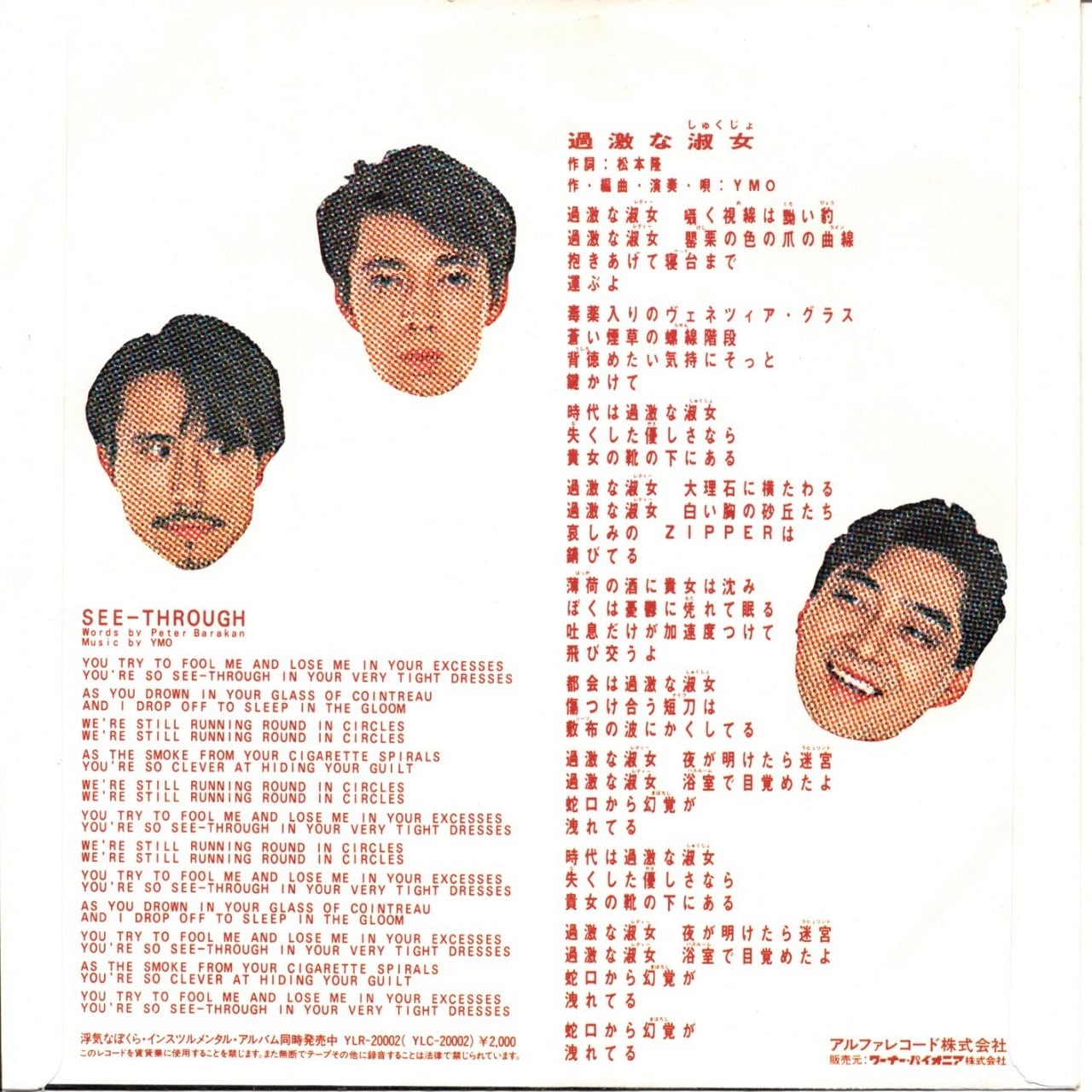 83年リリース、YMOの8枚目のシングルです。大ヒット曲「君に、胸キュン。」に続いてリリースされた、YMOの曲のなかで最も歌謡曲テイストの感じられる作品で、オリコンのシングル・チャートの15位を記録しました。元は中森明菜への提供を意図した曲でしたがプレゼンが失敗し、自分たちのものとしてリリースすることになったという経緯があります。なおシングルでは唯一のオリジナル・アルバム未収録曲です。B面曲は、のちにアルバム「サーヴィス」に収録される英語詞の曲で、作詞はピーター・バラカン、作曲はYMO3人の共作です。