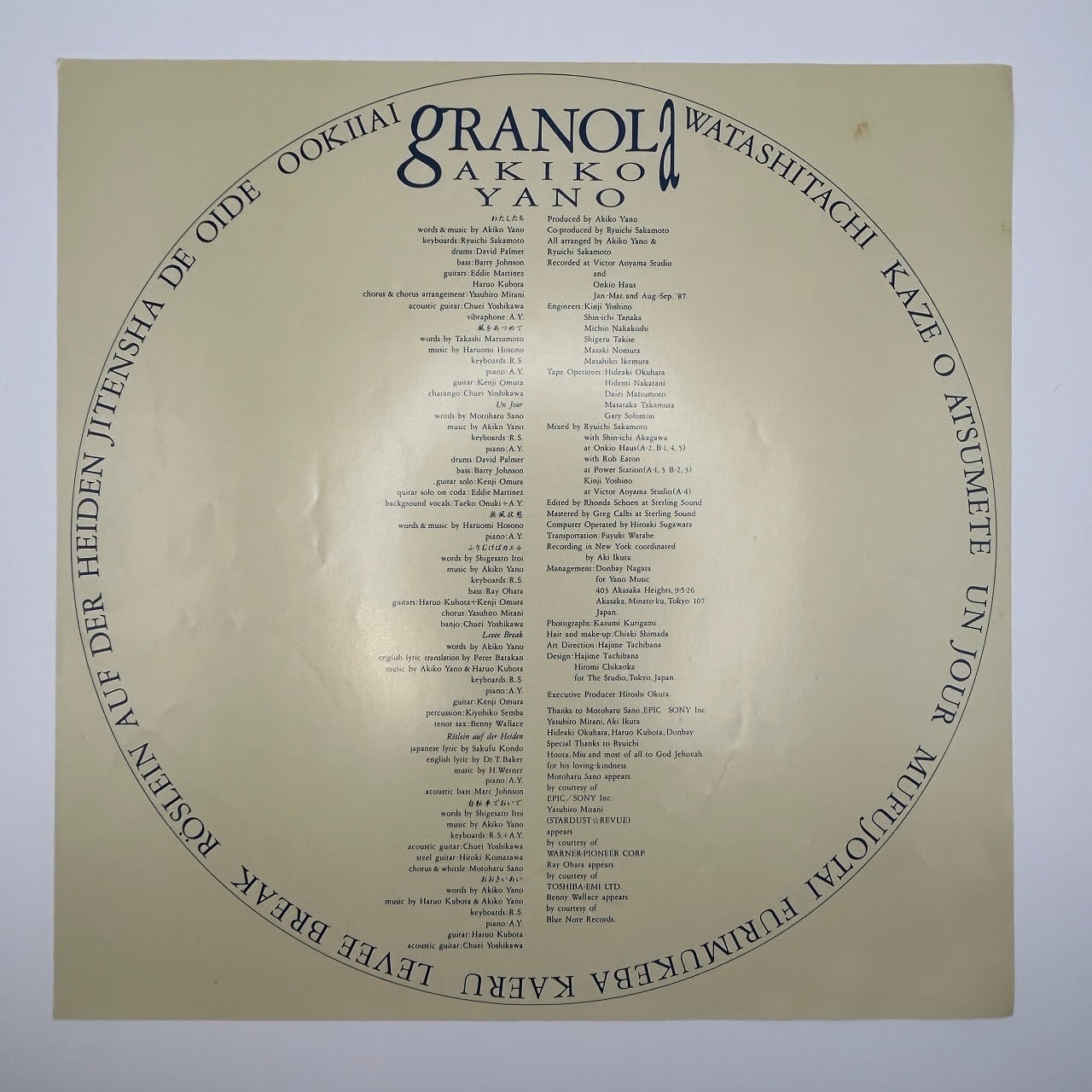 87年リリース、矢野顕子のスタジオ・アルバムです。前作「峠のわが家」を踏襲したバンド・サウンドが特徴で、テクノポップ的なサウンドはほぼ無く、彼女のピアノとバンドとのアンサンブルが楽しめる曲ばかりが収録されており、特に大村憲司と吉川忠英(B1でのバンジョーは絶品)のギターが前面に出ている曲が多いです。A2とA4ははっぴいえんどのカヴァー。A3の作詞は佐野元春で、B4では佐野と矢野がデュエットをしています。B1はNHKの「みんなのうた」でオンエアされた糸井重里作詞曲で、本盤の中ではもっともポップ。本作のツアーを終えて、彼女は「矢野顕子解散宣言」の名の元、育児休暇に入るということで、作品の随所に温かみやリラックス感が溢れています。