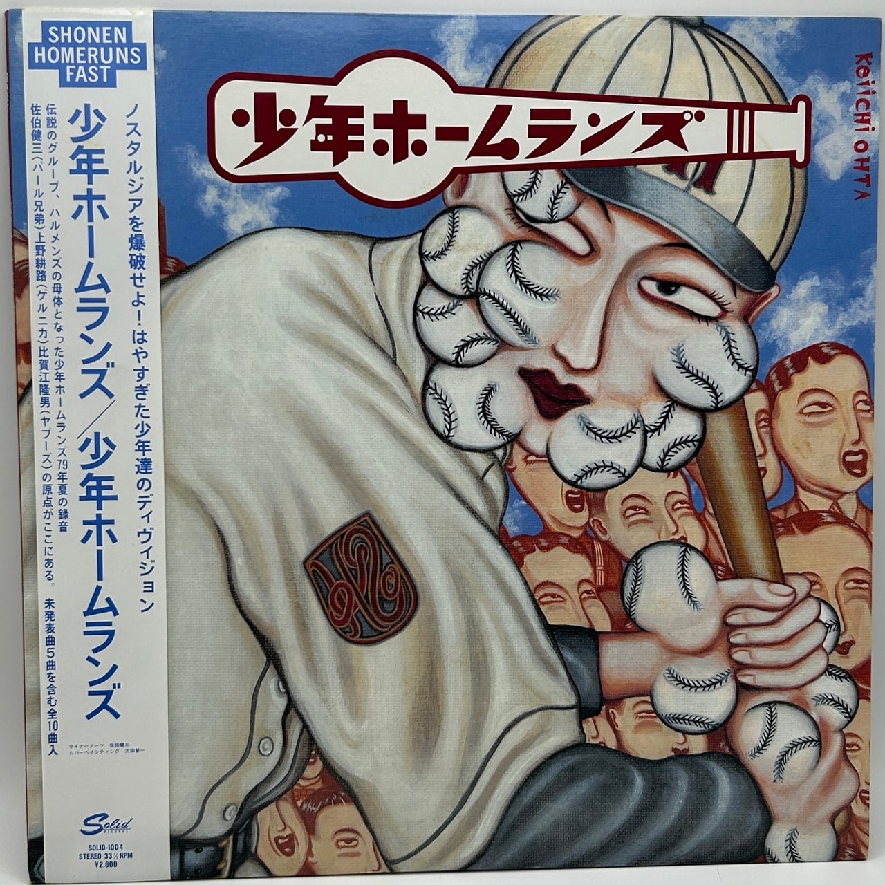 87年リリース、サエキけんぞうや上野耕路など日本のニューウェイヴの重要人物を輩出したハルメンズの前身バンド「少年ホームランズ」の唯一のアルバムです。後にハルメンズの作品に収録される曲もいくつか収録されていますが、ハルメンズ・ヴァージョンよりもサウンドがロックな感じで、録音時期の78~79年ではニューウェイヴの定型というものがまだ確立していなかったということが推測できます。B1はハルメンズと戸川純と3ヴァージョンがあるわけで、当然聴き比べ推奨です。歌詞はすべてサエキ(佐伯健三)で、どれもナンセンスな内容のものですが、初の録音作品であるB5はけっこうシニカルなメッセージ・ソング(ってほどでもないか…)なのが興味深いところ。ゲルニカのメンバーで、ヒカシューの「噂の人類」のジャケット画で有名な太田蛍一のアートワークも素晴らしく、本作にはまりすぎです。