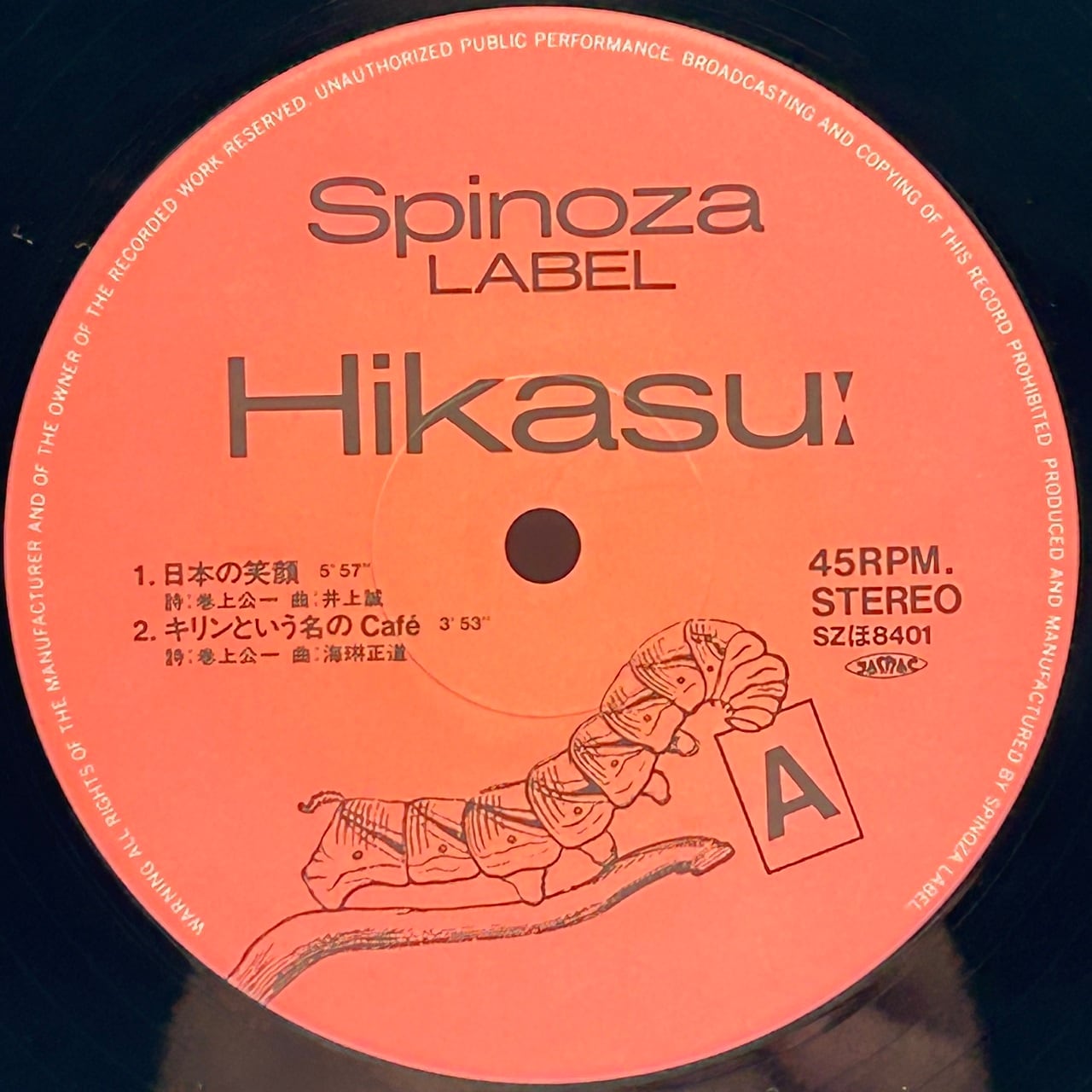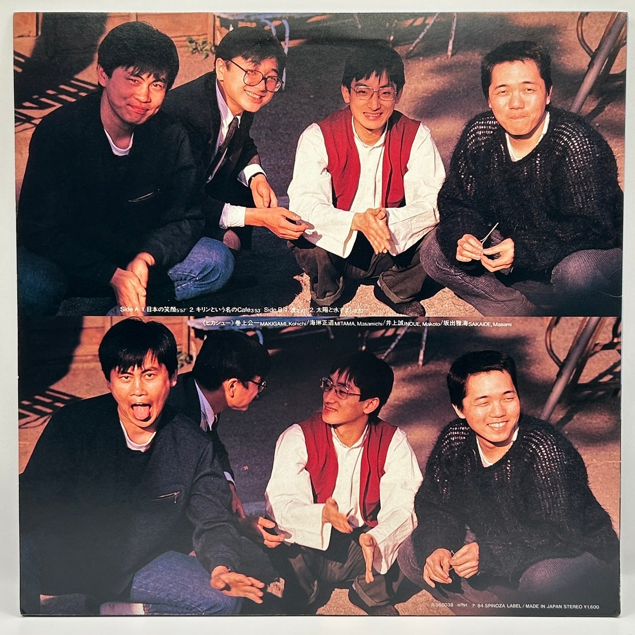 85年リリース、日本のニューウェイヴ・バンドの始祖、ヒカシューの12インチ・シングルです。84年に自主レーベル「Spinoza」からリリースされたものを日本コロムビア(の傘下のエッグマン・レーベル)が再発したもので、後にアルバム「水に流して」とのカップリングでCDでも発売されています。この頃のヒカシューはインディーズでの活動にシフトしていく最初の頃でしたが、結局は日本コロムビアからのリリース(再発)となったわけで、いいんです、流通はメジャーのほうが広範囲なんだから。さて、ナンセンスな歌詞は4曲とも巻上公一作で、A1にはクレジットがないもののだれでもわかる声で戸川純が参加。女性のヴォーカルで特徴のある人のひとりは戸川だが、男性ヴォーカルで彼女の声に対抗できるくらいアクが強いのは巻上くらいのものでしょう。裏ジャケの、なにか達観してしまったようなメンバー4人の写真がすばらしい。