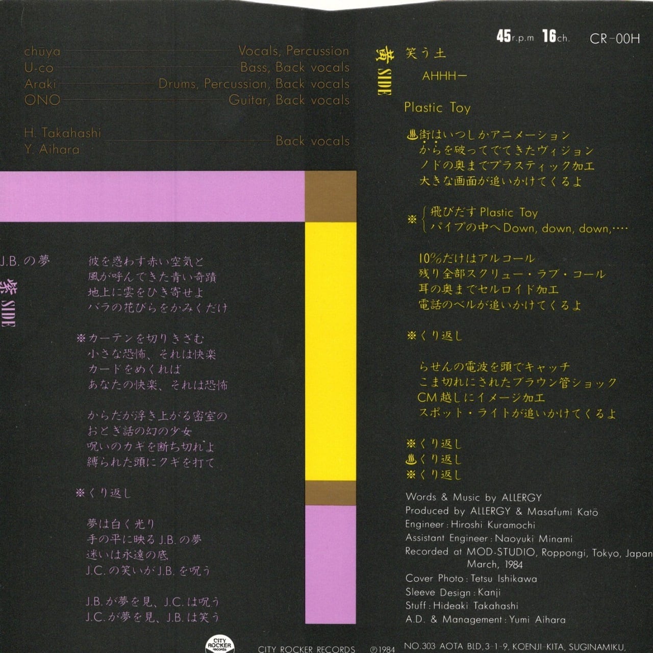84年リリース、日本のニューウェイヴ/ポストパンク・バンド、アレルギーのシングルです。雑誌「DOLL」編集長であった森脇美貴夫が設立したレーベルである「CITY ROCKER」からのリリースで、アレルギーのシングルとしては本盤が唯一作です。Aは代表曲で、後にリリースされた数枚のライヴ・アルバムすべてに収録されており、2014年の再結成でリリースされたフル・アルバムにもAとB1が再演され収録されています。ノイジーなギターと饒舌なベースに甲高い男性ヴォーカルと、ポストパンクのお手本のようなサウンドですが、古臭く聴こえないのはやはり曲が良くて演奏にメリハリがあるからでしょう。ポストパンクってどういうの?の質問に対する(日本の場合の)模範解答です。ジャケット・デザインも秀逸です。