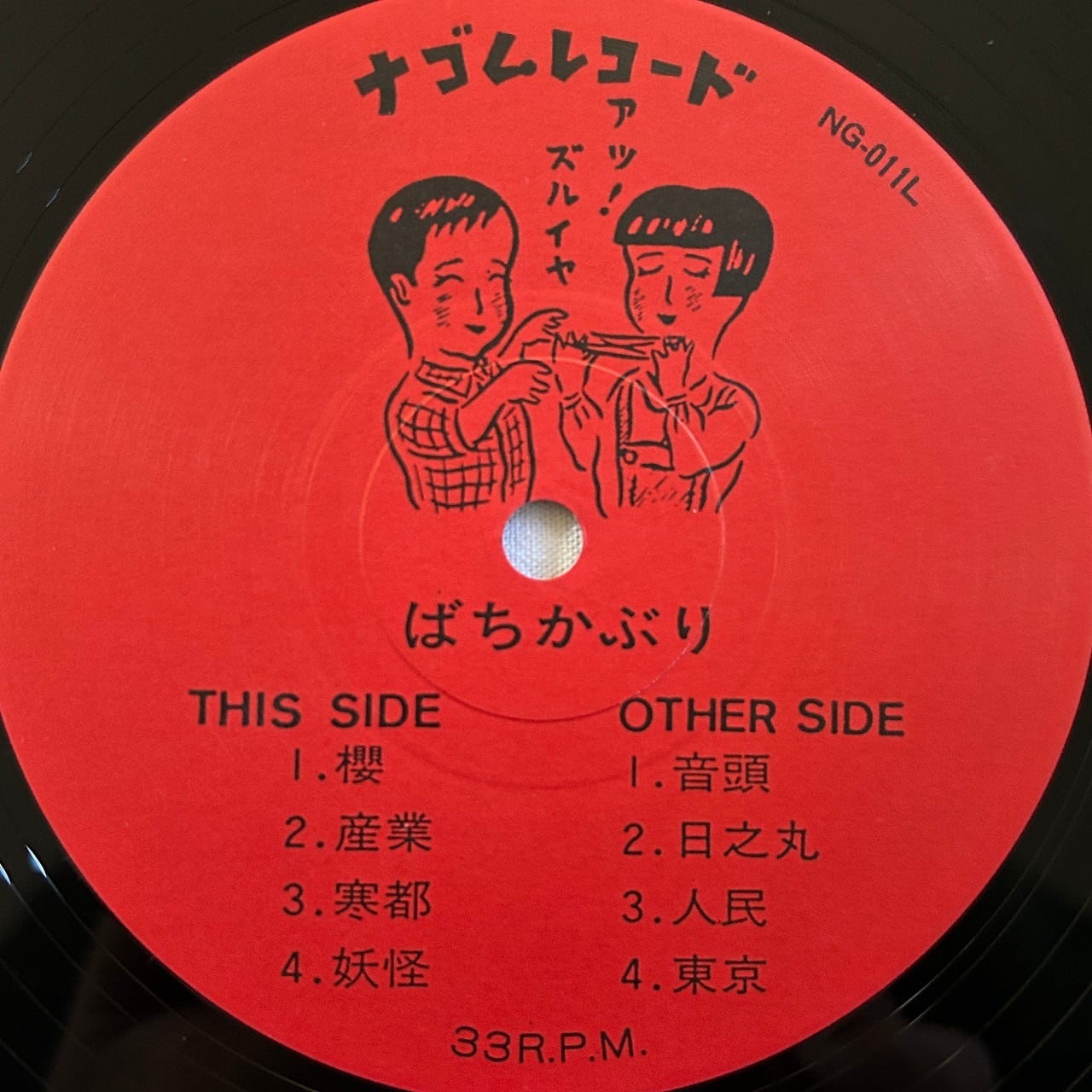 85年リリース、個性派俳優として活躍する田口トモロヲ率いる「ばちかぶり」のファースト・アルバムです。この時のメンバーは、ベースがア太郎、ギターにマリン、ヴォーカルの田口トモロヲはこの時はトモロー表記で、ドラムスのケンジロは、ニウバイルのメンバーでもあった木原健二郎です。素直にエイト・ビートを刻む楽曲はなく、どの曲もアヴァンギャルドで、よく言えばニューヨーク・パンクやノー・ニューヨーク勢らの音楽性に近い感じです。とは言っても、全く高尚なものではなく、例えば(有名曲の)A2は「うんこ食べたら40万円」というトモローのだみ声に「うんこ!うんこ!」のコーラスが被さるといったもの。どこがノー・ニューヨーク・パンクなんだ。訂正。なお、参加ミュージシャンやアーティストが豪華で、プロデュースのケラをはじめ、ヒカシューの巻上公一、町田町蔵、水玉消防団の天鼓、ブリキの自発団の銀粉蝶、劇団健康の犬山犬子など地下音楽や劇団の有名人が多数参加していますが、彼らはどの曲のどの部分に参加しているのかは不明。巻上公一のトランペットと篠田昌巳のサックスはわかりますが、記念として知り合いや関係者名を列記したというのが本当でしょう。なんだかイメージがわかない曲名ばかりですが、A4の「妖怪」は妖怪人間ベムのテーマ曲のカヴァーです。なお、初版は金色のバックに蛭子能収のイラストが書いてあるのですが、本盤は背景が黄色の通常盤です。