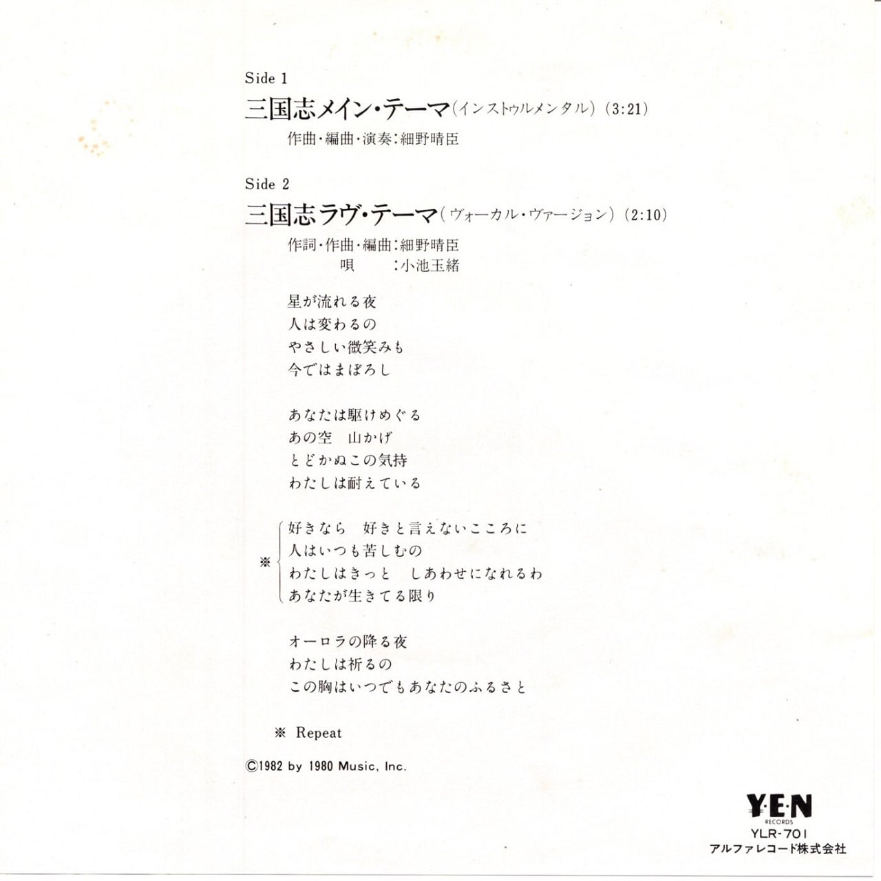 82年リリース、YMOの細野晴臣のシングルです。ソロ・シングルとしては76年の「北京ダック」以来、通算4枚目ということになります。82年から84年までNHKで放映された「人形劇 三国志」のメインテーマで、A面はオリエンタル&エキゾチックなシンセ・インスト・ナンバーで、細野のオリジナル・アルバムには未収録ですが、85年の小品集「コインシデンタル・ミュージック」に入っていてもおかしくない名曲です。というか「シムーン」や「中国女」のようなYMOのファースト・アルバム感がありますね。B面はそのテーマを小池珠緒が歌ったヴァージョンで、これが小池の音楽作品のデビューとなりました。