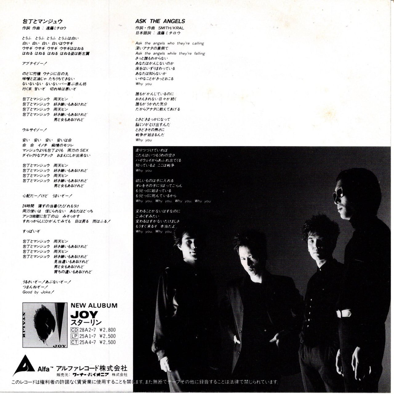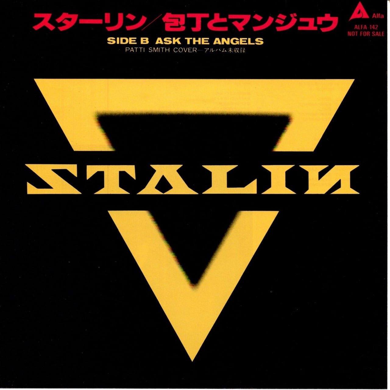 89年リリース、遠藤ミチロウ率いる定冠詞「ザ」のないスターリンのデビュー・シングルです。同日に発売されたアルバム「JOY」の収録曲で、この時のメンバーはドラムスに元ルースターズの三原重夫、ギターにTHE LIPSの山盛愛彦、ベースにパラノイア・スターにも参加していた西村雄介という布陣です。タイトルの意味は、男性器と女性器の比喩であると遠藤はインタビューで述べていますが、歌詞の内容としてはあまり必然性のない言葉に感じます。スターリン再デビューに、このタイトルはキャッチーじゃないし。歌に歌われるうさぎやとうふというワードもなにか空回りしている感あり。シニカルにもコミカルにもなっていない。「天ぷら」や「Go Go スターリン」のような鮮烈な歌詞を書いていた遠藤はここにはいません。サウンドがザ・スターリンの頃に比べて厚みがありヘヴィでゴージャスなのに、これでは宝の持ち腐れです。一方でB面のパティ・スミスの楽曲のカヴァーはなかなか秀逸。アコースティックかつサイケデリックで、解散前のザ・スターリンと、ソロになってからの遠藤の弾き語りをブレンドしたかのよう。アルバム未収録曲なので、ファンであればこの曲を聴くだけのためにこのシングルを持つべきです。