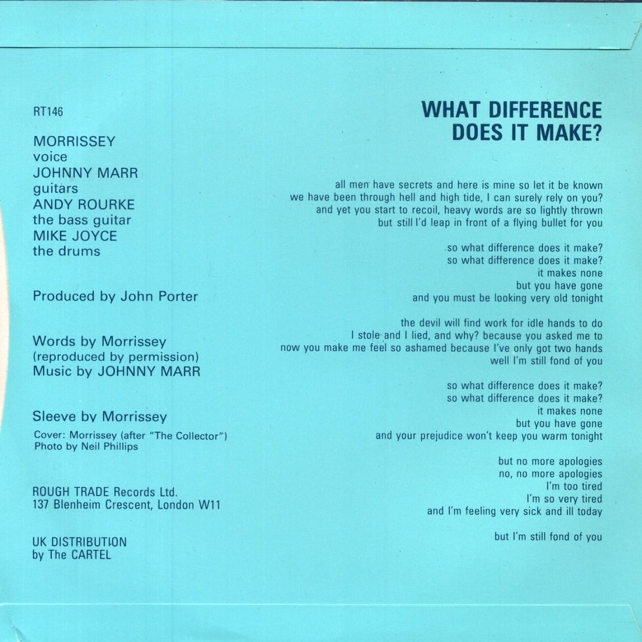84年リリース、スミスのシングルです。通算3枚目のシングルで、ファースト・アルバム「The Smiths」のリード・シングルとしてリリースされ、UKインディー・チャートの1位を獲得し、全英シングル・チャートでは12位まで上昇するヒットとなりました。曲のタイトルは、ジャック・ケルアックの著書である、男性ふたりのアメリカ放浪記「ザ・ダルマ・バムズ」の主人公であるレイ・スミスのセリフから取ったもので、歌詞の内容も小説のストーリーと同様、男同士の別れといったものです。この曲の場合は恋人同士の別れということになるわけですが。いつも秀逸なモリッシーによるジャケット・デザインは、映画「The Collector」(1965年)の撮影現場で、カメラマンであるニール・フィリップスが撮影したテレンス・スタンプのスナップを元にしたものでしたが、スタンプから使用許諾が得られなかったため、モリッシー自身がスタンプを模倣した写真を使用しています。その後、スタンプの許諾を得たため元のデザインでも販売されましたが、ファンなら両方持つ必要がありますね。