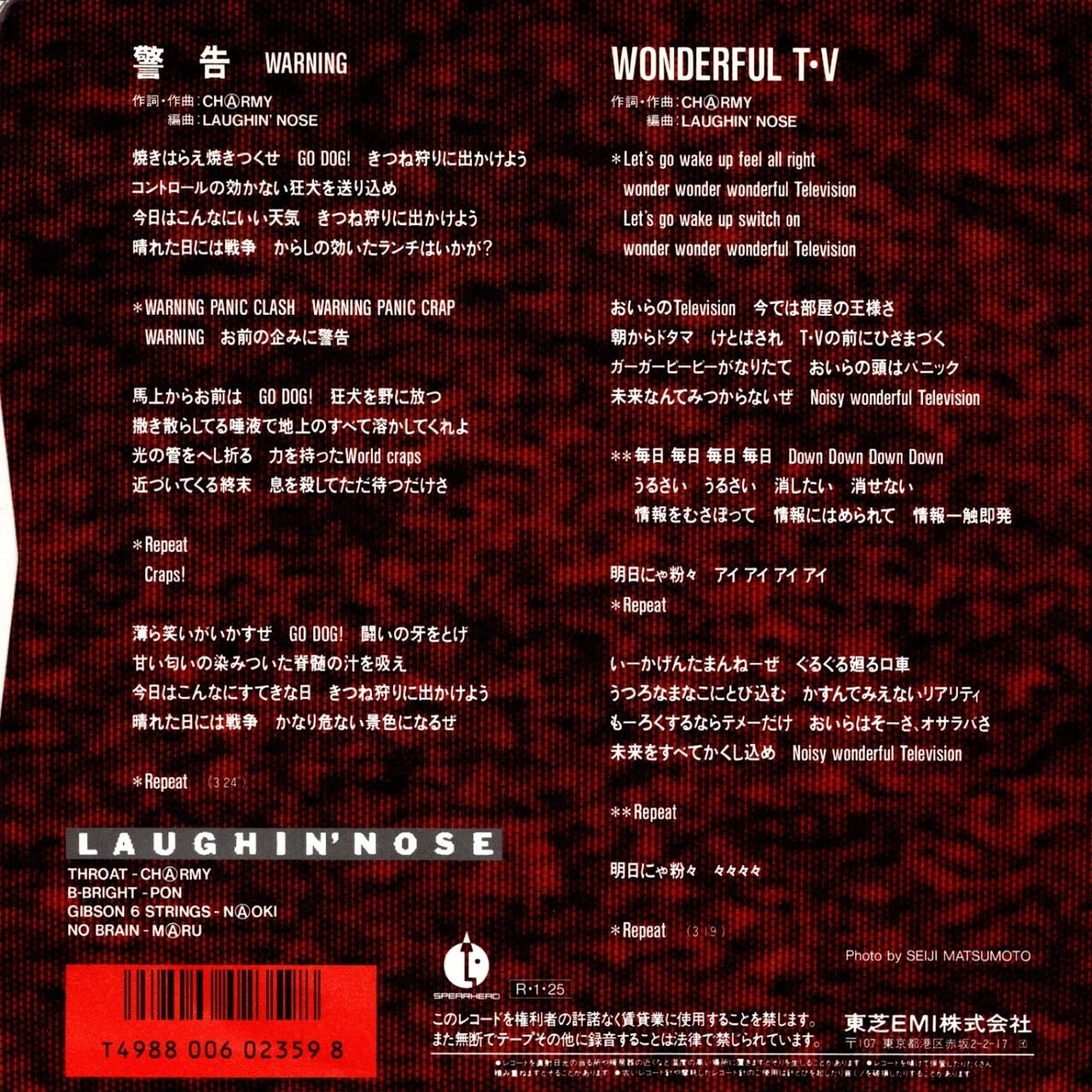 ラフィン・ノーズが日比谷野音での将棋倒し事故、謹慎を経てレコード会社を東芝EMIに移り初めてリリースしたシングルです。前作のシングルである「ラフィン・ロール」の能天気さとは真逆のヘビーなサウンドで、チャーミーの声もしわがれています。歌詞の内容も戦争開始への警告だったり、情報過多な現代社会への警鐘だったりとテーマが重くなり、やはり事故の影響が作品に大きく反映されていることがうかがえて、息が苦しくなります。ですが、考えてみれば、メジャー・デビュー前には戦争反対であるとか社会問題について歌っていた彼らですから、今作がある程度の原点回帰であったと、今になれば理解することができます。