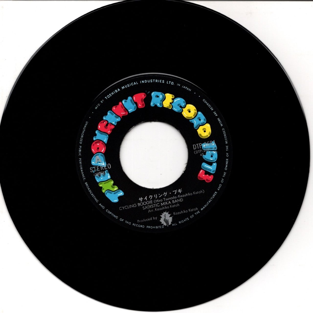 72年リリース、加藤和彦とミカの夫婦を中心に結成されたサディスティック・ミカ・バンドのファースト・シングルです。名うてのミュージシャンを輩出したバンドですが、この時のメンバーは加藤夫妻に高中正義、そしてドラムスに角田ひろ(つのだ☆ひろ)でした。当時、優秀なドラマーとして引く手あまたであった角田は、本作リリース後に自分のバンドを結成するために脱退し、高橋幸宏が加入するわけですが、この時点での角田の存在は大きく、両面とも作詞は彼によるもの(B面は松山猛との共作)で、バンドにおける彼の重要性を物語っています。サウンドはミカによる「レッツゴー、ドーナッツ!」のシャウトで始まるノリ一発の躁状態ブギ。リード・ヴォーカルは加藤和彦ですが、ミカがリード・ヴォーカルでもよかったのでは?そっちが聴きたかった。クレイジーなギターソロも絶品。