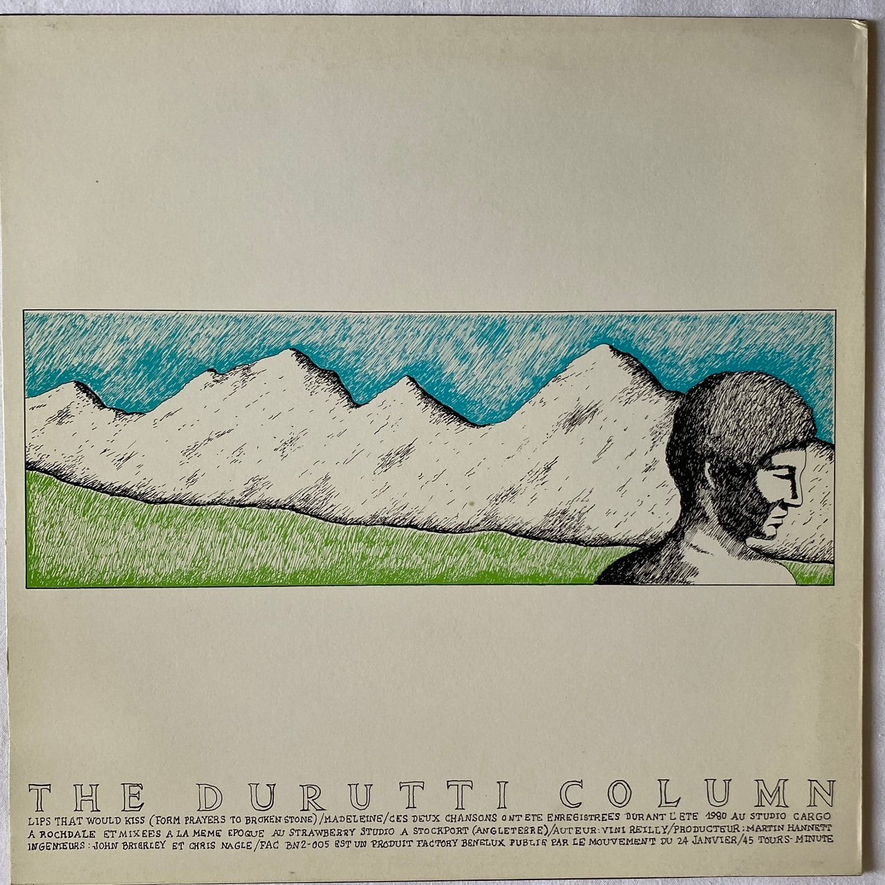 80年リリース、孤高のギタリスト、ヴィニ・ライリー=ドゥルッティ・コラムのシングルです。ベルギーのファクトリー・ベネルクスからのリリースなので、本国イギリスではリリースされておらず、当然チャートにも入りませんでしたが、本家ファクトリー・レコードからリリースされてもチャートにランクインするような類の音楽作品でなかったのは確かです。ちなみに、シングルというフォーマットでは、本作がドゥルッティ・コラムのファースト・シングルということになります。プロデュースはファースト・アルバムの「The Return of The Durutti Column」を手がけたマーティン・ハネットですが、サウンドの質感は彼の参加していないセカンド・アルバム「LC」に近い感じです。初期の手癖で弾くフュージョンのような楽曲から、浮遊感のあるメロディアスなものに移行しつつある過渡期的な作品と言えそうです。そしてメロディに漂う哀愁も味わい深いですが、それはテーマがジョイ・ディヴィジョンのイアン・カーティスの死にあるからかもしれません。なお、なにやら意味ありげな山脈男の不思議なジャケットは、ファクトリー・ベネルクスやクレプスキュールの作品のカヴァー・デザインを多く手掛けているジャン・フランソワ・オクターヴによるものです。