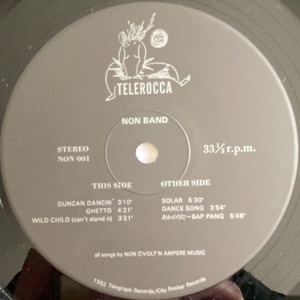 82年リリース、初期東京ロッカーズのマリア023に在籍したノンを中心に1979年に結成されたノン・バンドのデビュー・ミニ・アルバムです。ヴォーカルとベースのノンにドラマーの玉垣満、ヴァイオリンの山岸騏之介という3人編成で、オムニバス・アルバム「都市通信」に参加した後ライヴ・ソノシートをリリースし、地引雄一の自主制作レーベルであるテレグラフ・レコードからリリースされたのが本作です。音数が少ないスカスカしたサウンドは、イギリスのスリッツを想起させますが、独創性ではこちらのほうが上かも。ノンはベースをほとんど弾かないのに、どの曲もファンキーに聴こえるのが素晴らしい。2017年にはドイツのレーベルから12インチでリイシューされましたが、やはりオリジナルの10インチで聴きたいものです。
