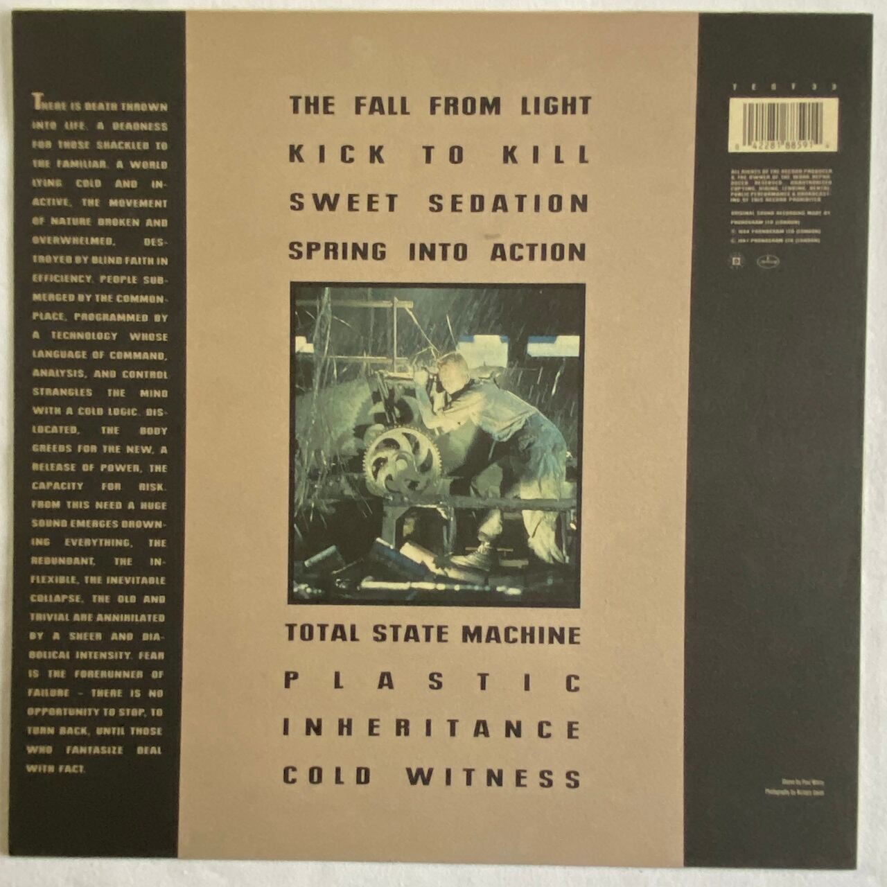 87年リリース、イギリスのインダストリアル・ミュージック・バンド、テスト・デパートメントのセカンド・アルバムです。84年に2枚組ボックス・セットでリリースされたファースト・アルバムを1枚に編集したものですが、ボックスに入っていた様々なインサートや写真等はないものの、45回転2枚組を33回転1枚にしたので、曲の欠落はありません。A面1曲目から、売りであるメタル・パーカッションが乱打されますが、それが止むとけっこうな静寂が訪れます。当時はとにかく過激という文脈で語られましたが、テクノを経た今では(曲によっては)アンビエントの一種と捉えることもできるでしょう。とは言え、白眉は終始メタル・パーカッションが乱打されるB2からB4の3曲で、アジテーションと金属の打撃音だけの音の塊にはテンションが上がります。テスト・デパートメントは、当時ドイツのアインシュテュルツェンデ・ノイバウテンと双璧を成すメタル・パーカッション・バンドと認識されていましたが、B4ではそのノイバウテンのE・M・アインハルトがゲスト参加しています。またA4のみ、当時サイキックTVのジェネシス・P・オリッジがプロデュースを担当しています。ちなみにタイトルの「Beating The Retreat」とは、軍隊の儀式のひとつで、一日の終わりに行われる儀仗演奏のことです。
