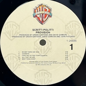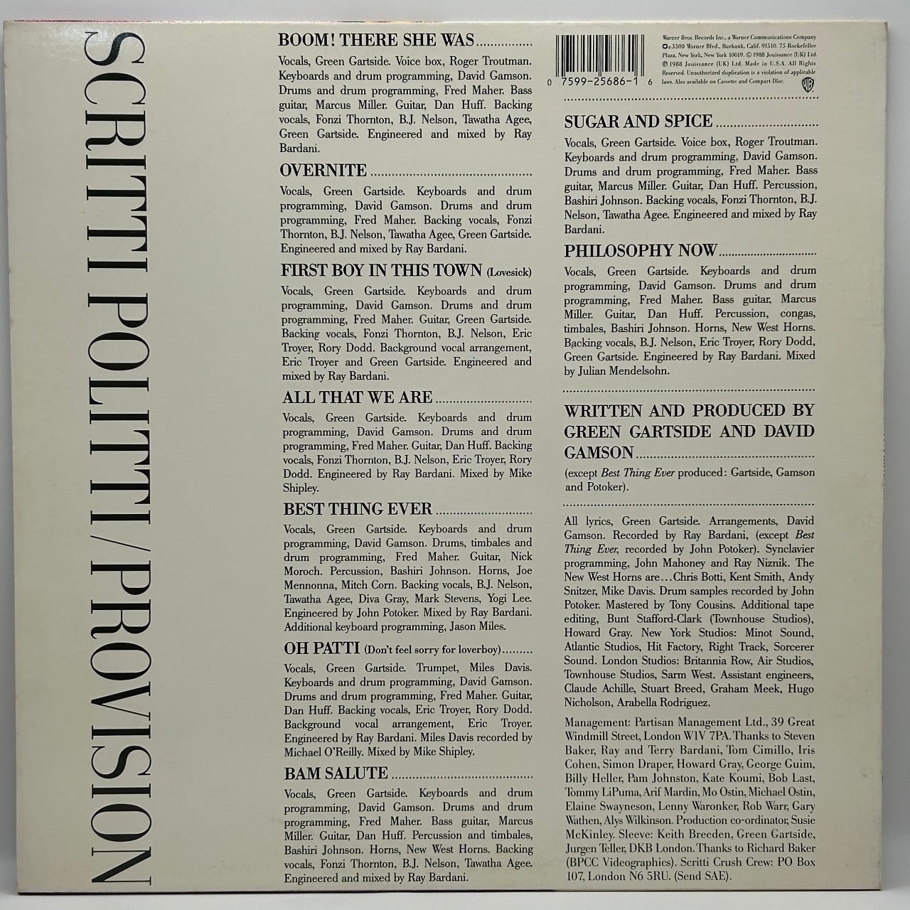 88年リリース、UKウェールズ出身のグリーン・ガートサイド率いるスクリッティ・ポリッティのサード・アルバムです。前作「Cupid & Psyche 85」ではデジタルなファンク・サウンドが印象的でしたが、本作もそれを踏襲しています。全英アルバム・チャート8位のヒットとなり、ビルボード200では113位を記録しました。マイルス・デイヴィスが参加のB1は全英シングル・チャートの13位、ザップのロジャー・トラウトマンが参加したA1はビルボード・ホット100の53位のヒットとなり、名実ともにスクリッティ・ポリッティは世界的なバンドになりました。そんな派手な実績のある本作ですが「Cupid & Psyche 85」の収録曲に比べてフックのある曲が少ないので、けっこう落ち着いたサウンドにも聴こえます。アタックの強いリンドラムの音や、やたらきらびやかなヤマハDX7やシンクラヴィアのシンセ・サウンドが、今聴くとちょっと古臭さを感じさせますが、時代があとひと回りもすれば味になるでしょう。相変わらずメロディは美味しいです。