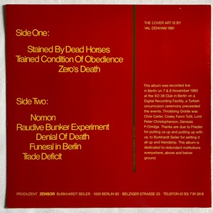 81年リリース、スロッビング・グリッスルのライヴ・アルバムです。80 年 11 月7日と8日にベルリンのSO36クラブで行われたライヴ・パフォーマンスを録音したもので、このSO36とは、80年代のドイツのパンク・ロック・ムーヴメントやオルタナティヴ・カルチャーの拠点であったところで、現在も映像をしています。演奏はほぼ即興で、鼓動のようなビート、シンセの効果音、メロディを吹かないトランペットなどのバックトラック(と言えるのかな)に、ジェネシス・P・オリッジによる霊媒師の祝詞のような呟きや、トランス状態に入った宗教者のような絶叫が被さるといったもの。イメージするアグレッシヴさやノイジーさはみじんもなく、終始静けさが漂います。レコードを聴いているだけでは楽しめない、体験する音楽。本作は10000枚の限定盤で、裏ジャケには「このアルバムは、地上地下を問わず、あらゆる場所の廃れてしまってた施設に捧げる」と書いてあります。ジャケット画は、イギリス・ヨークシャー出身のアーティストで、トランスジェンダーのアイコンであるヴァル・デナムによるもので、彼女はこの後サイキックTVやマーク・アーモンドのジャケットに作品を提供することになります。