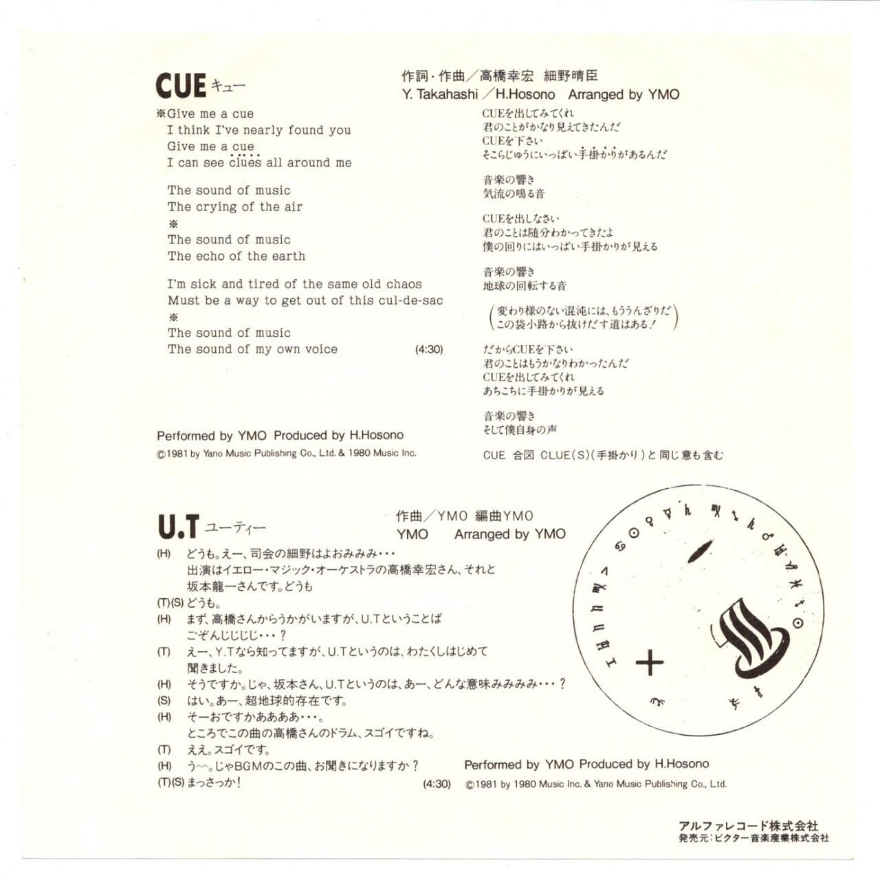 81年リリース、YMOの4枚目のシングルです。アルバム「BGM」からのファースト・シングル・カット曲で、作曲は高橋幸宏と細野晴臣、作詞はピーター・バラカンが担当しています。ニューウェイヴ・ファンにはウルトラヴォックスの「passionate reply」に酷似していることでも有名ですが、名曲であることは確かで、アルバム「BGM」を代表する曲と言っていいでしょう。B面曲も同アルバム収録曲ですが、凄まじいドラムとクールなシンセ・サウンドにより、ヨーロッパでは「ハードコア・テクノの元祖」と評されています。