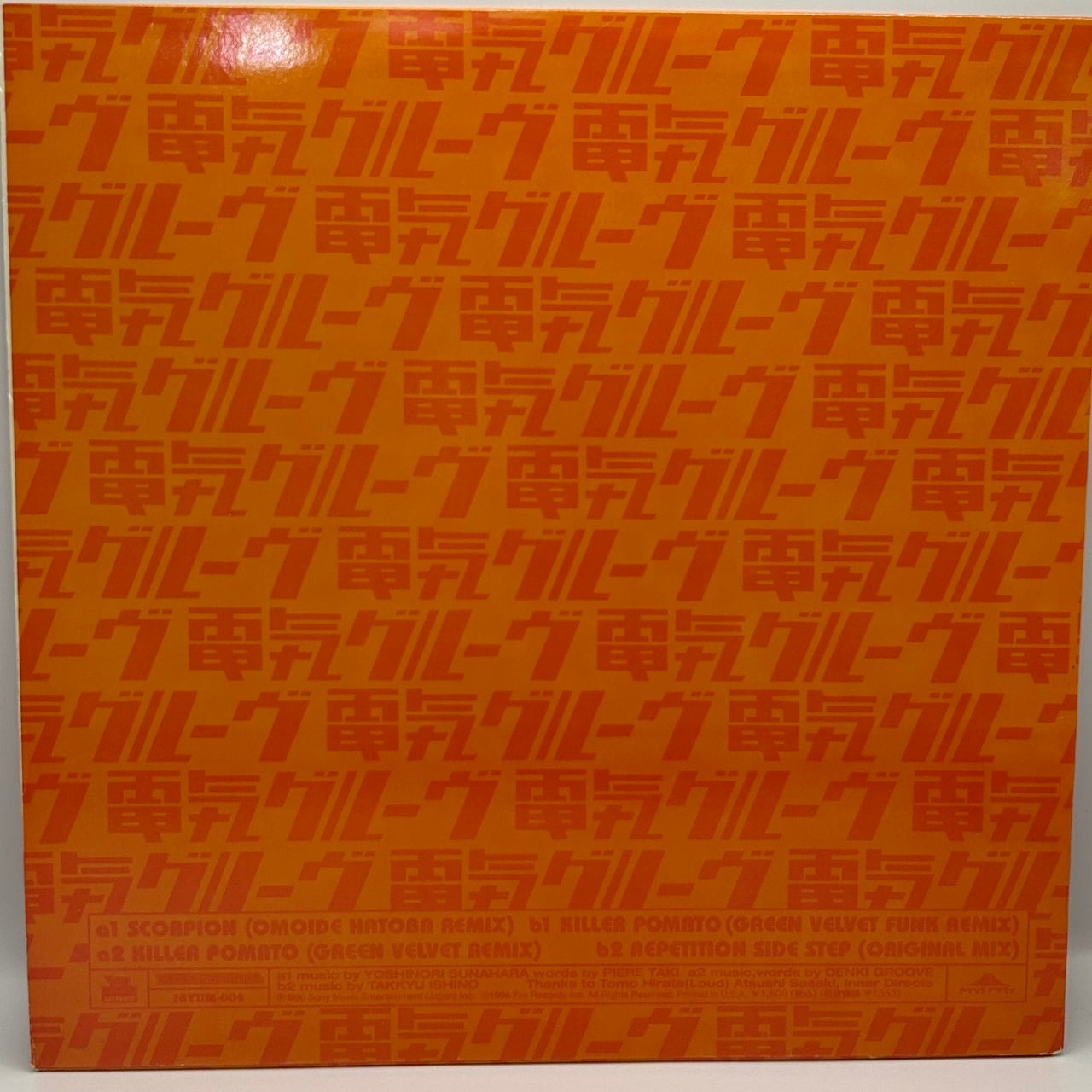 96年リリース、電気グルーヴの12インチEPです。同年リリースの6枚目のアルバム「Orange」収録曲のリミックス集で、リミキサーは山本精一と津山篤と大串崇による想い出波止場、A2とB1はアメリカのDJ/音楽プロデューサーのグリーン・ヴェルヴェットが務め、B2は石野卓球によるオリジナル・ミックスが収録されています。換骨奪胎するような大胆なリミックスではありませんが、オリジナルにあったユーモアはほとんど残っていない、シリアスな出来上がりと言えましょう。ふざけてるのはジャケット・デザインだけ。