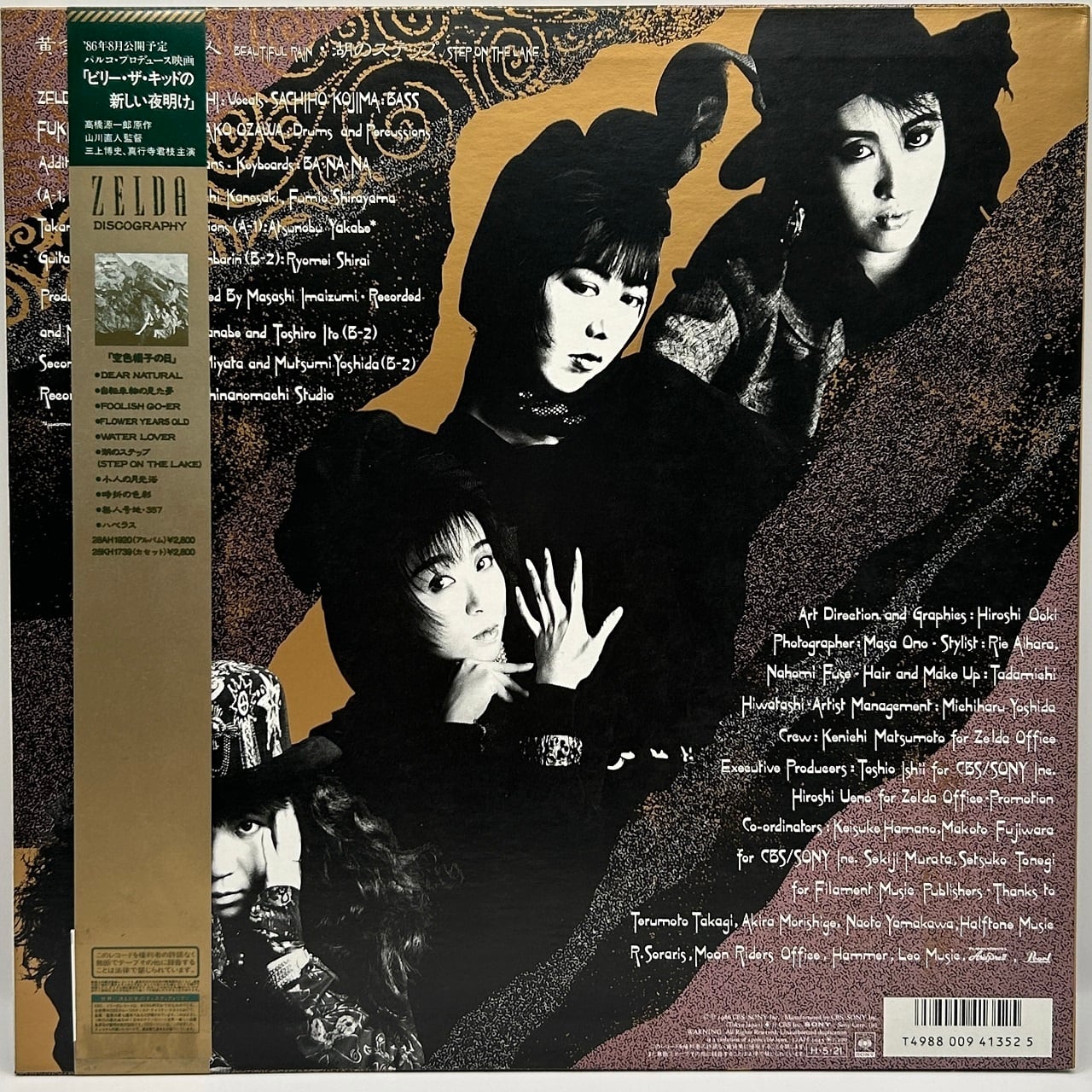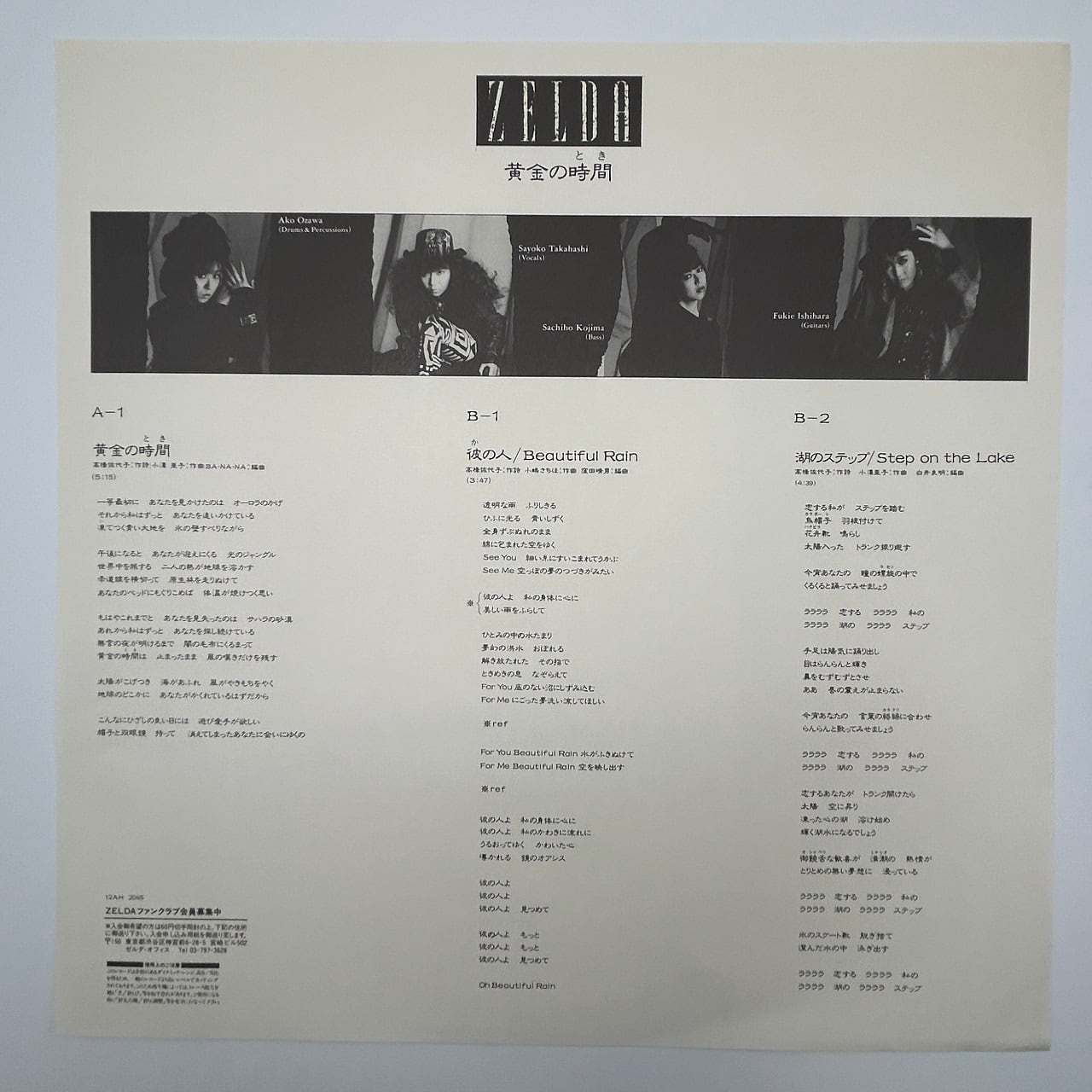 86年リリース、女性ニューウェイヴ・バンド、ゼルダ初めての12インチ・シングルです。タイトル曲は、原案と脚本が高橋源一郎で監督が山川直人の映画「ビリィ★ザ★キッドの新しい夜明け」の主題曲で、ゼルダは映画に出演もしています。打ち込み多用の、ゼルダとしては新機軸な曲で、その仕掛人はEP-4の川嶋BANANAです。B1も打ち込みやシンセ多用のアップテンポでクールな曲ですが、こちらは窪田晴男の編曲。ここまでの2曲はオリジナル・アルバム未収録です。B2はネオアコ的なサウンドのサード・アルバム収録曲で、これをシングルのタイトル曲にするのもありだったのではと思ってしまうほどの佳曲です。