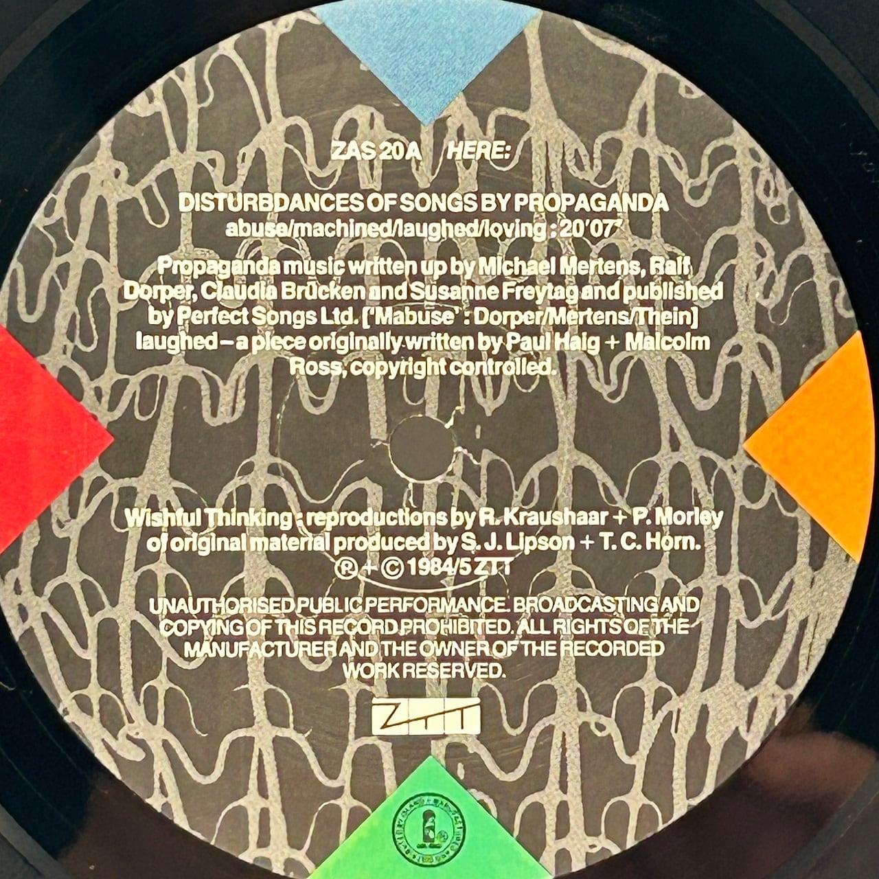 85年リリース、ドイツ出身の男女混成シンセポップ/ニューウェイヴ・バンド、プロパガンダのリミックス・アルバムです。A面B面をHere/Thereと名づけ、ファースト・アルバムの「シークレット・ウィッシュ」をZTTレーベルのポール・モーリーとボブ・クラウシャーがコンパイルしリミックスしたものです。本来はアメリカのクラブ・マーケット向けのプロモーション用だったようですが、ファースト・アルバムのリリースと同じ年にリリースされました。プロパガンダがZTTで制作したのはファースト・アルバム一枚だけで、本作は彼ら自身はまったくタッチしていないので、これは契約のごたごたでリリースとなったものではないのかと推測もできます。セールス的にも全英アルバム・チャートの82位止まりと失敗でしたが、ポップでビートのはっきりしたシンセサウンドはとっても煌びやかです。B4だけなんとなく異色だなと思ったら、なんとスロッビング・グリッスルの「ディシプリン」のカヴァー!もう、これだけで「買い」です。